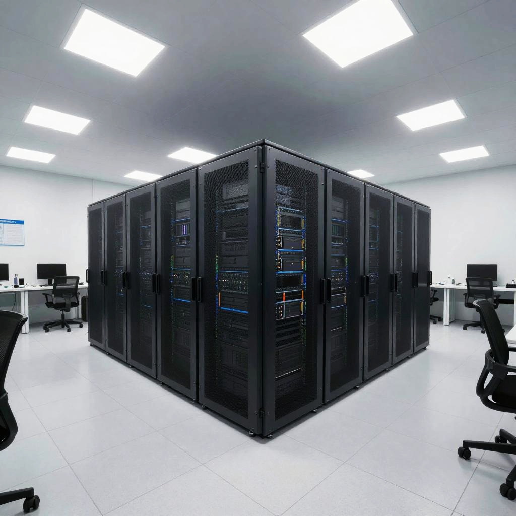 Server Room, White walls, Floor tiles, Desks and office chairs, Bright and huge ceiling lights, masterpiece, (best quality:1.2), (ultra detailed:1.2), ultra high res, (realistic:1.3), (photorealistic:1.5), sharp details, 8K, extremely detailed 8k wallpaper, intricate, highly detailed, photographed on a nikon z7
