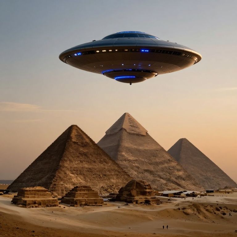 Photograph of a futuristic, blue-lit UFO hovering above ancient Egyptian pyramids at sunset, with sandy ruins and distant figures in the foreground.