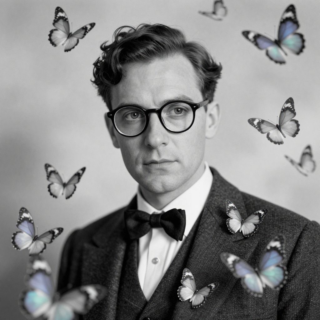 Black-and-white portrait of a man with glasses, bow tie, and suit, surrounded by iridescent butterflies on a gray background.