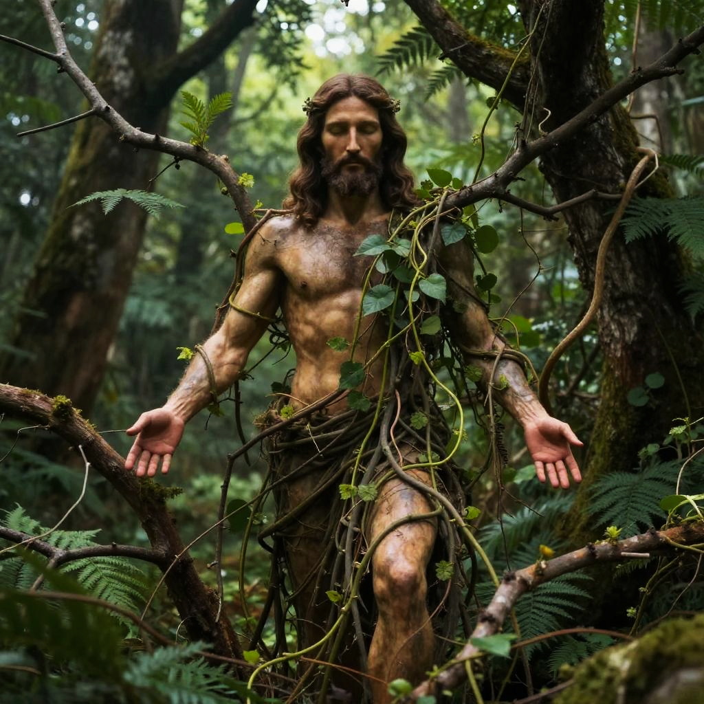 A surreal portrayal of hesus intertwined with nature, branches and vines growing around his form, blending human and tree elements, using vibrant green and brown colors with a dreamlike atmosphere
