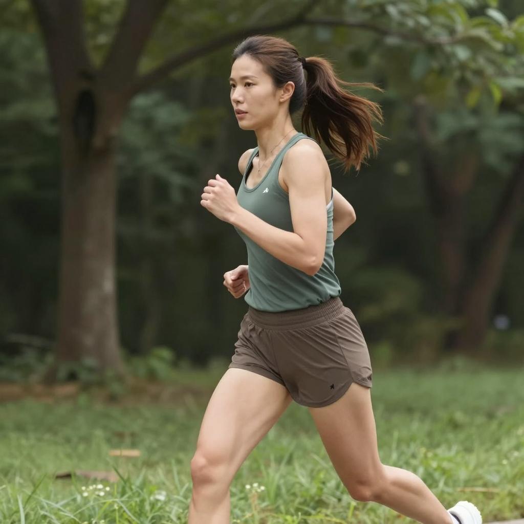 Portrait of an Asian female golfer standing outdoors on a golf course wearing a white Nike polo shirt, white cap, white pants, white belt, and golf glove while holding a golf club. The background features green blurred trees, capturing a sunny day with natural daylight. The subject appears confident and sporty with a slight smile.