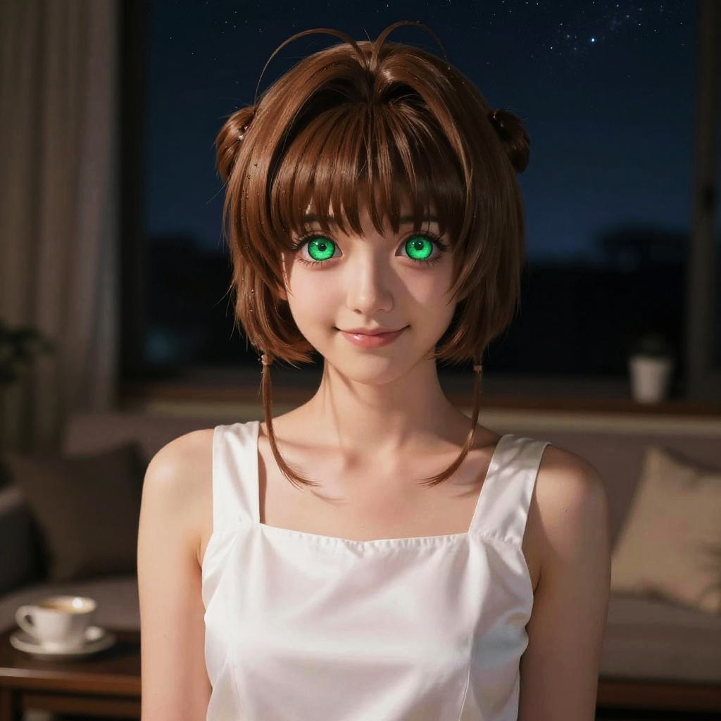 Masterpiece, 1girl, highres, kinomoto_sakura, green eyes, face focus, wearing (simple white silk dress:1), smiling, looking at viewer, petite(midnight:1), starry sky, darkness, moody lighting, in the living roomrealistic lighting, very detailed, full of detail