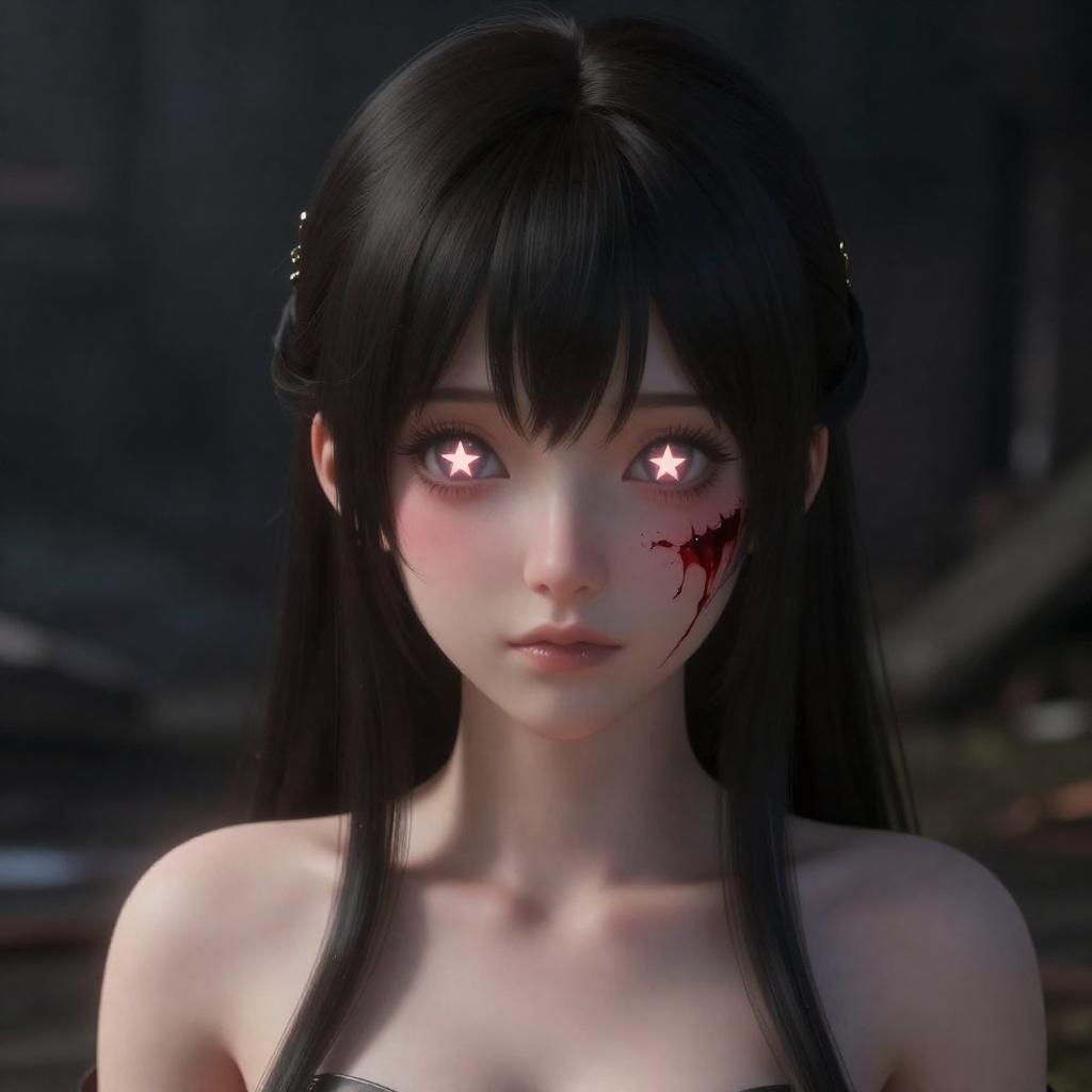 High-resolution portrait of a petite girl with short brown hair styled in small buns and striking green eyes. She is wearing a simple white silk dress and smiling gently while looking at the viewer. The setting is a dimly lit living room at night with a starry sky visible through the window and moody, realistic lighting enhancing the detailed facial features.