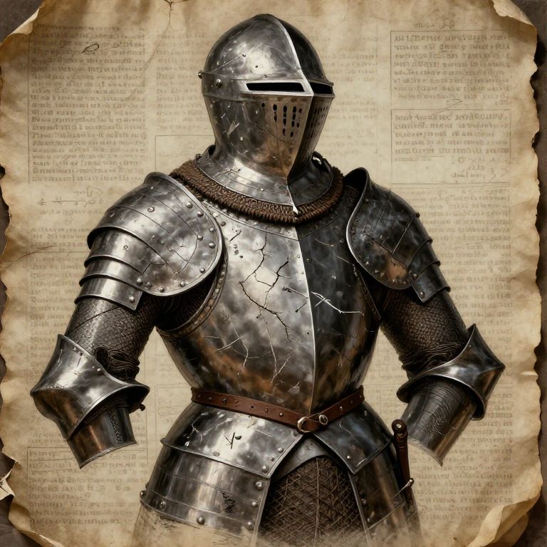 Photograph of medieval knight's shiny, cracked steel armor with a visor helmet, brown belt, and chainmail, against aged parchment background.