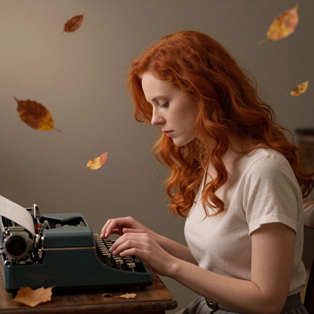 A woman with vibrant red hair sits pensively at a vintage typewriter, her hands poised over the keys as autumn leaves drift gracefully through the air behind her, casting a warm, ethereal glow over the scene.