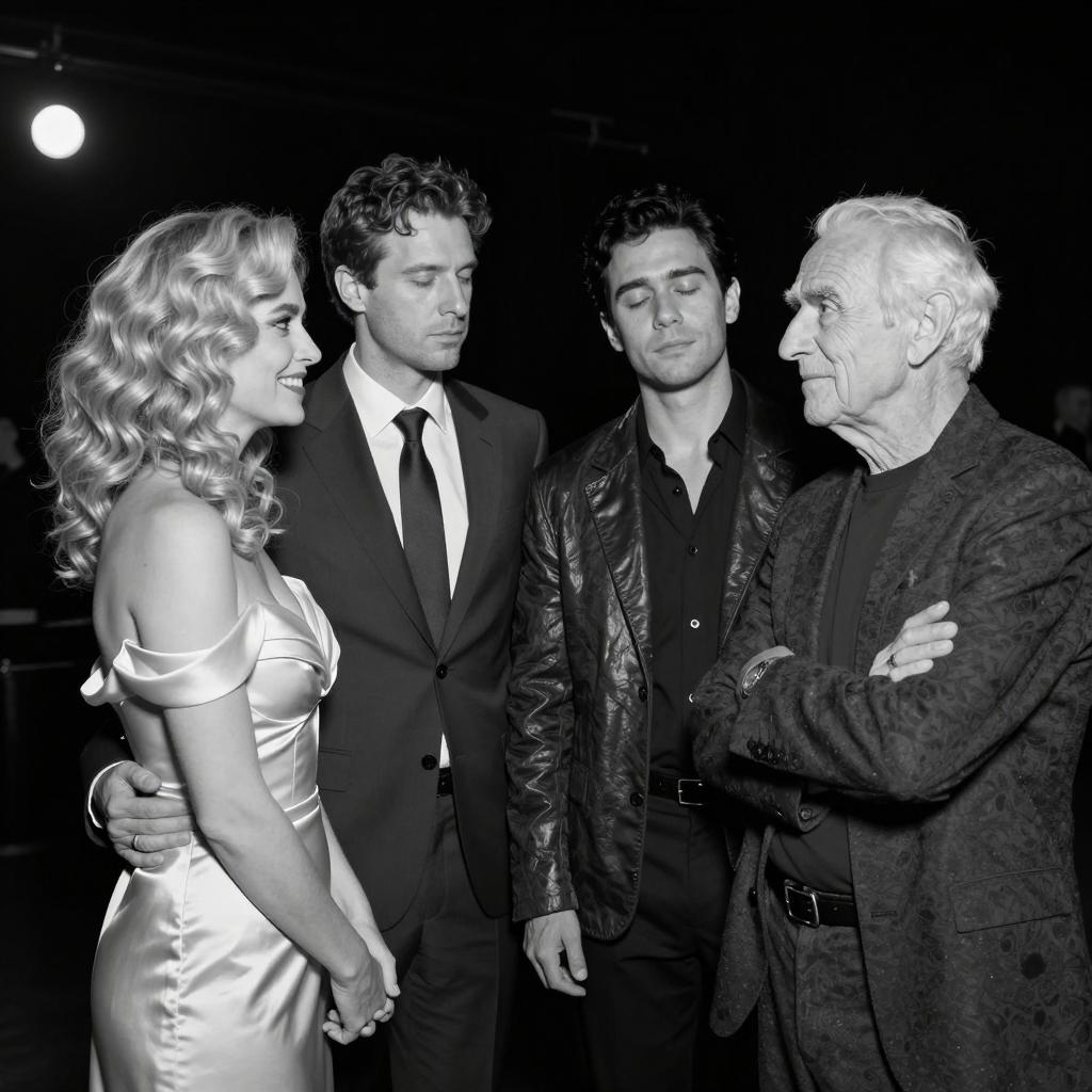 Black and white photograph showing three people: an elderly man with white hair and a suit leaning over a seated blonde woman in a white dress with a square neckline, wearing a necklace with the letter 'R'. A younger man with dark hair, dressed in a suit and tie, sits to the right looking intently. The elderly man's hand rests gently on the woman's arm, and the background features vertical curtains.