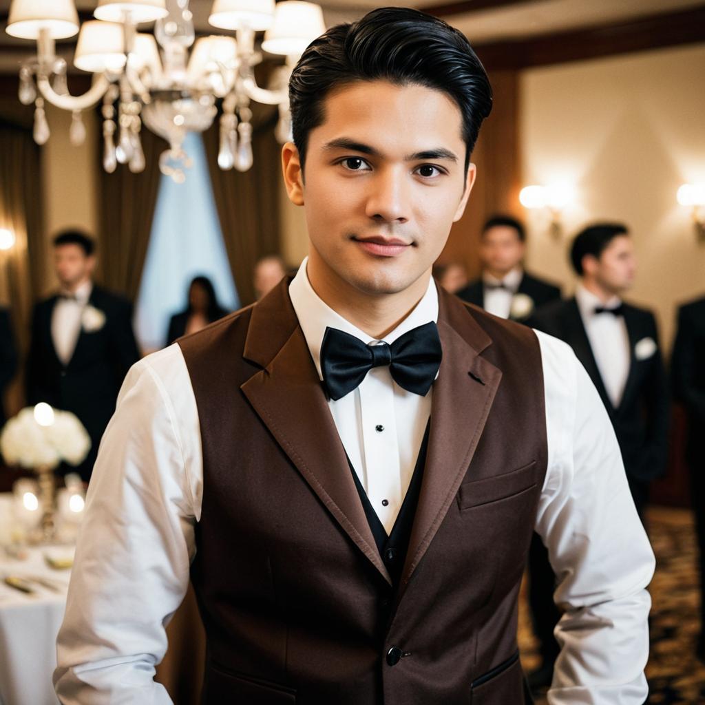 Groom costume reception,male focus, 1boy, bow, bowtie, black hair, looking at viewer, jacket, realistic, blurry, shirt, pants, chandelier, blurry background, formal, white shirt, vest, suit, brown jacket, solo, indoors, brown eyes