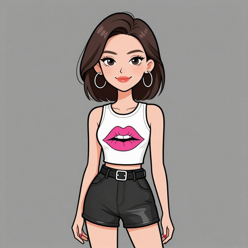 Illustration of a smiling young woman with medium-length dark hair wearing a white sleeveless graphic tank top featuring pink lips print, paired with high-waisted black leather shorts and a black belt. She accessorizes with large hoop earrings and has pink nail polish, set against a plain gray background.