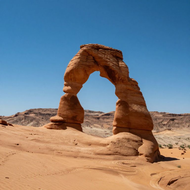 Photograph of a natural rock arch formation in a desert landscape under a clear, bright blue sky. The arch is composed of reddish-brown, weathered sandstone with visible textures and layers. It stands prominently in the center, with the sandy ground featuring smooth, undulating dunes in the foreground. In the background, distant rocky hills with similar reddish hues add depth to the scene. The sunlight casts sharp shadows, enhancing the arch's three-dimensional appearance. The overall composition emphasizes the natural beauty and stark contrast of the desert environment.