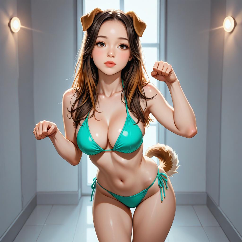 This digital illustration features an attractive young Asian woman with long, wavy brown hair and brown dog ears, wearing a turquoise string bikini that accentuates her curvy, hourglass figure and medium-sized breasts. She has a fluffy brown dog tail and is standing in a brightly lit hallway with white walls and two round wall lights. Her expression is cute and playful, with clenched fists in a mock fighting stance. The background is minimal, focusing attention on her. The art style is highly detailed and realistic, with smooth textures and vibrant colors.