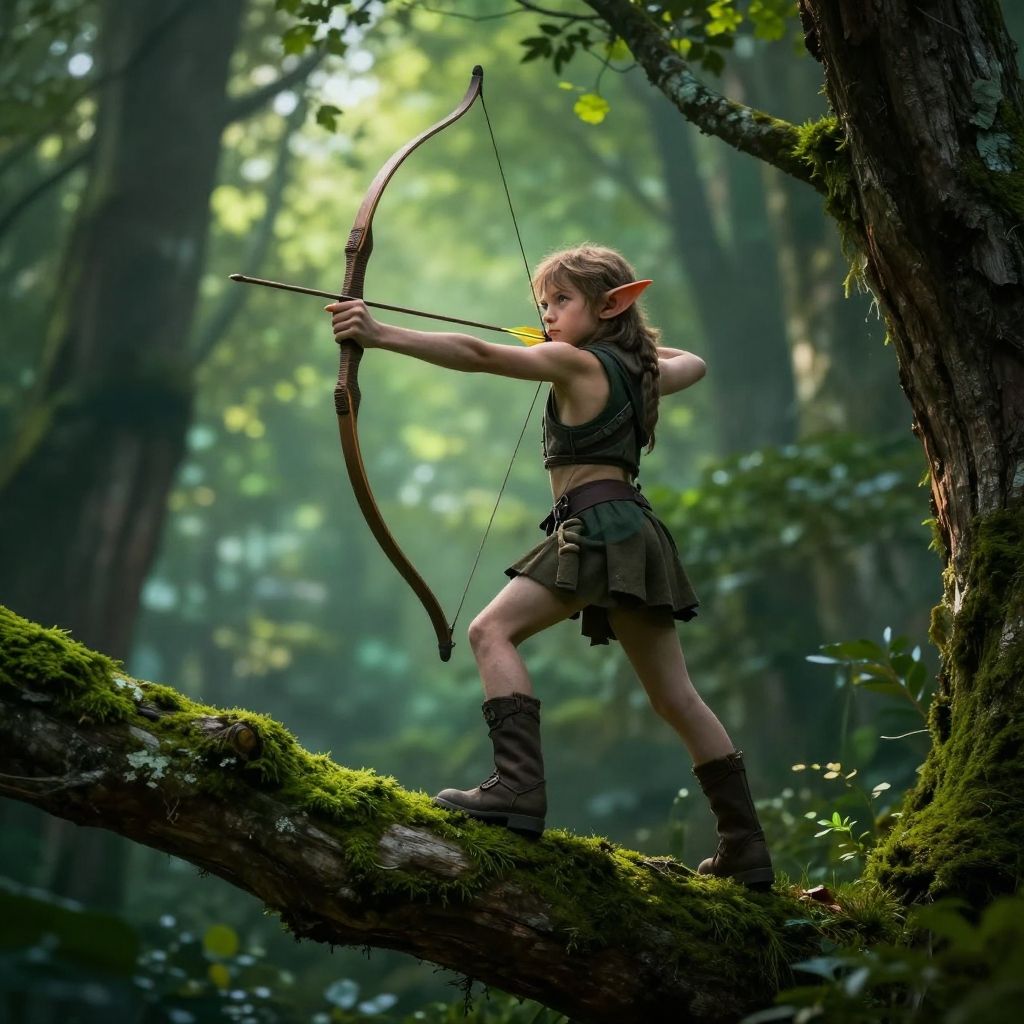 Young goblin archer aiming a bow atop a moss-covered tree branch, focused gaze, lithe build, forest canopy background with magical light filtering through leaves