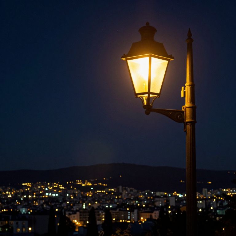 Warm light emanates from a vintage streetlamp, casting a golden glow against the star-studded night sky as distant hills and a twinkling cityscape stretch out below.