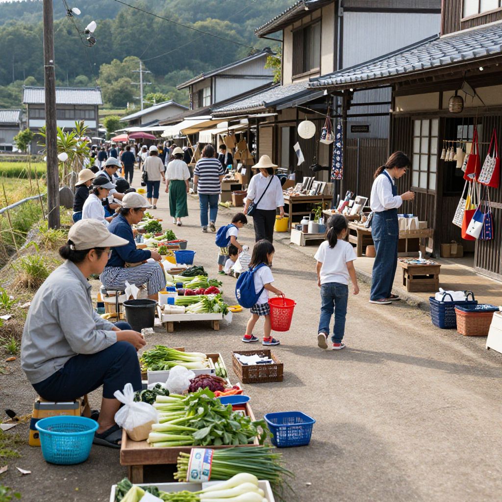 Photograph of a bustling outdoor Japanese market with vendors, children, and shoppers; colorful vegetables displayed, traditional wooden buildings, and green hills in the background