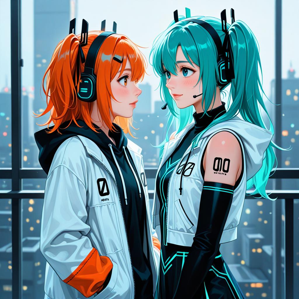 Digital anime-style illustration of two girls embracing. One girl has long teal hair styled in twin tails, wearing a white jacket and a futuristic headset with a glowing eyepatch. The other girl has orange hair tied with white ribbons, wearing a sleeveless black top, with a black tattoo-like design on her upper arm and orange gloves. Both characters exhibit detailed facial expressions and a slight blush. The background is a simple dark gradient.