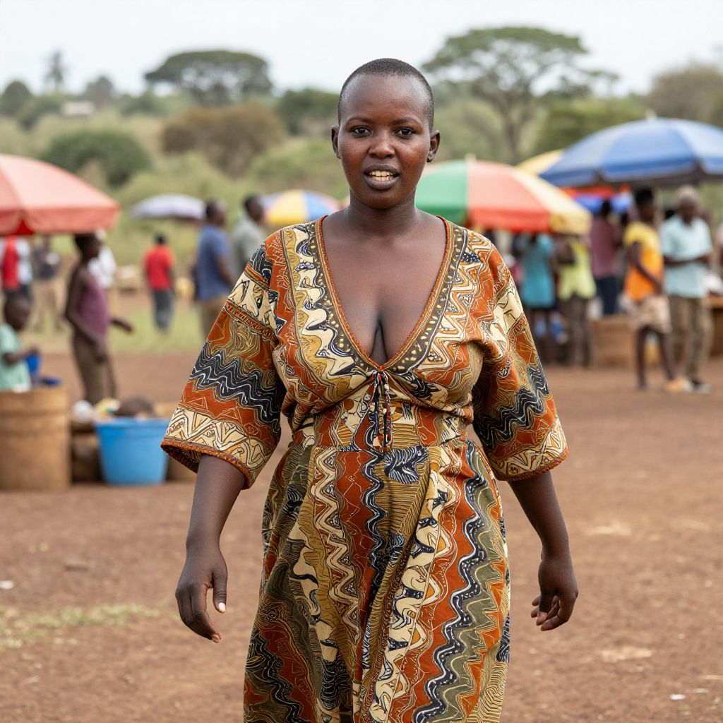 A realistic lifestyle photograph of a Tanzanian tribal-inspired woman, dressed in flowing earthy patterned attire featuring cultural motifs like waves, birds, and zigzags in natural tones such as rust, olive, and sandy brown; she is walking through a vibrant agro-pastoral village with vibrant local market stalls, her face showing joyful energy, with full brow ridges, deep lips, and bright eyes.. The woman has big tits and cute face