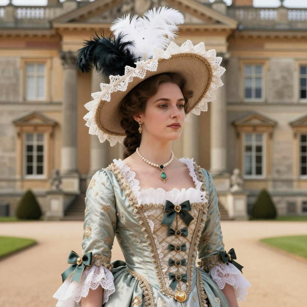 This elegant woman is dressed in a stunning historical costume, showcasing the intricate fashion of the past. Her large hat adorned with feathers and lace adds a touch of sophistication, perfectly complementing the grandeur of the surrounding estate. The image evokes a sense of timeless beauty and classic charm.