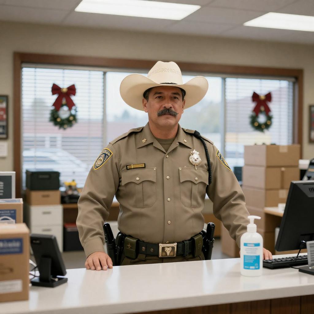 Photograph of a middle-aged male police officer with a mustache, wearing a beige uniform and cowboy hat, standing behind a store counter. The store has large windows with blinds, Christmas decorations, and stacks of boxes. A bottle of hand sanitizer is on the counter, and a phone and various items are on the left.