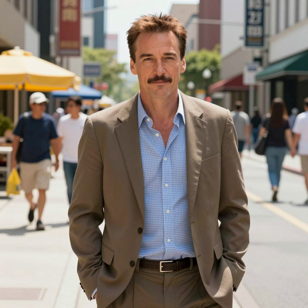 Breaking bad jane costume, photo of a man, standing in a grand hallway, wearing glasses, light blue button-up shirt, brown pants, brown shoes, white undershirt, long brown hair, mustache, looking straight at camera, hands in pockets, chandelier in background, checkered floor, yellow and gray walls, realistic style, slightly serious expression, casual attire, daytime, indoors, wide shot