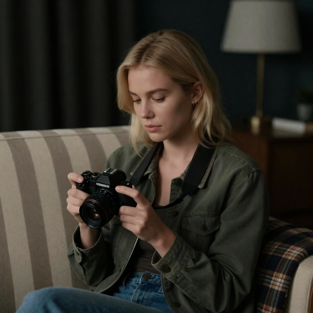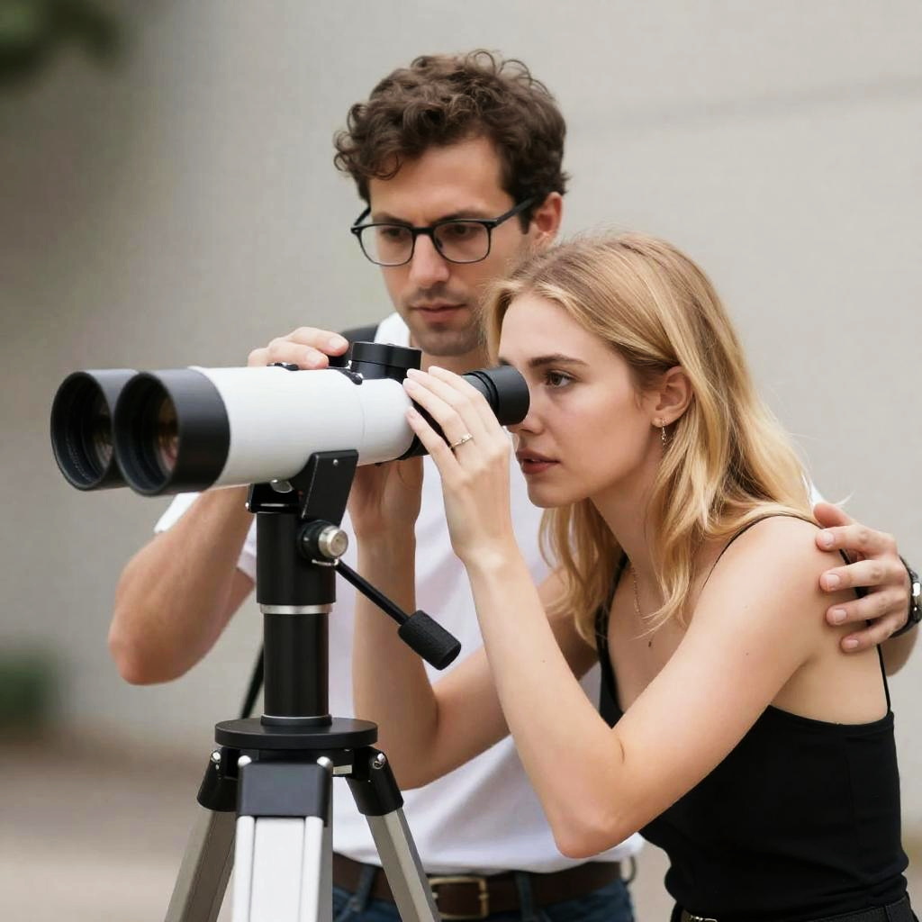 Photograph of a man and woman with a telescope. The man with dark hair, glasses, and white shirt stands behind, his hand on her shoulder. The woman with blonde hair, black strapless dress, leans forward, looking through the telescope. The telescope is large and white with black accents. Both have focused expressions. The background is blurred.