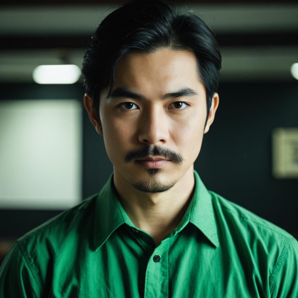Close-up portrait of an Asian man with black hair and facial hair wearing a green collared shirt. He has a mustache and beard, is looking directly at the camera with a serious expression, set against a dark and blurred indoor background.