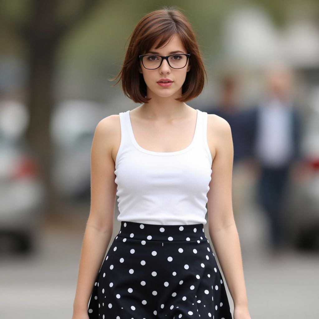 Photograph of a young woman with fair skin and a short, dark brown bob haircut. She wears black-framed glasses, a white sleeveless tank top, and a black skirt with white polka dots. The background is blurred, showing indistinct people and trees, suggesting an urban outdoor setting. Her expression is neutral, and she stands facing the camera with a slight forward lean. The image has a shallow depth of field, focusing sharply on her while the background remains out of focus. The overall style is casual and modern.