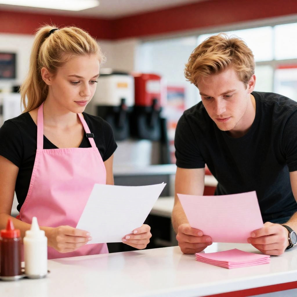 Photograph of a diner scene with two people. Blonde woman with ponytail, pink apron, black shirt, holding paper. Blonde man, black shirt, leaning forward, holding pink paper. Counter with soda dispensers, condiments, and pink napkins in background. Both look focused. Background has blurred diner elements.