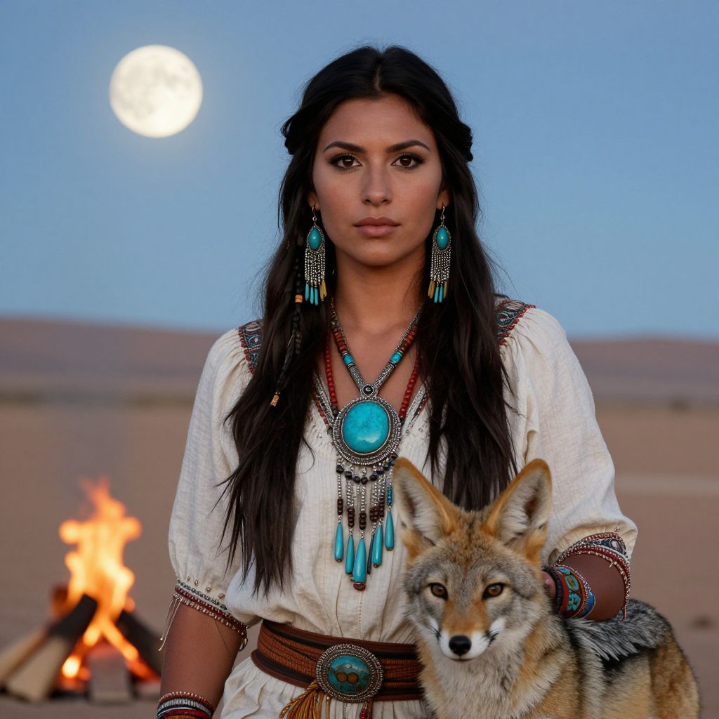 A beautiful young Apache woman with long dark hair and dark brown eyes, wearing turquoise jewelry, stands in front of a campfire with a small coyote beside her, under a full moon in a desert landscape.