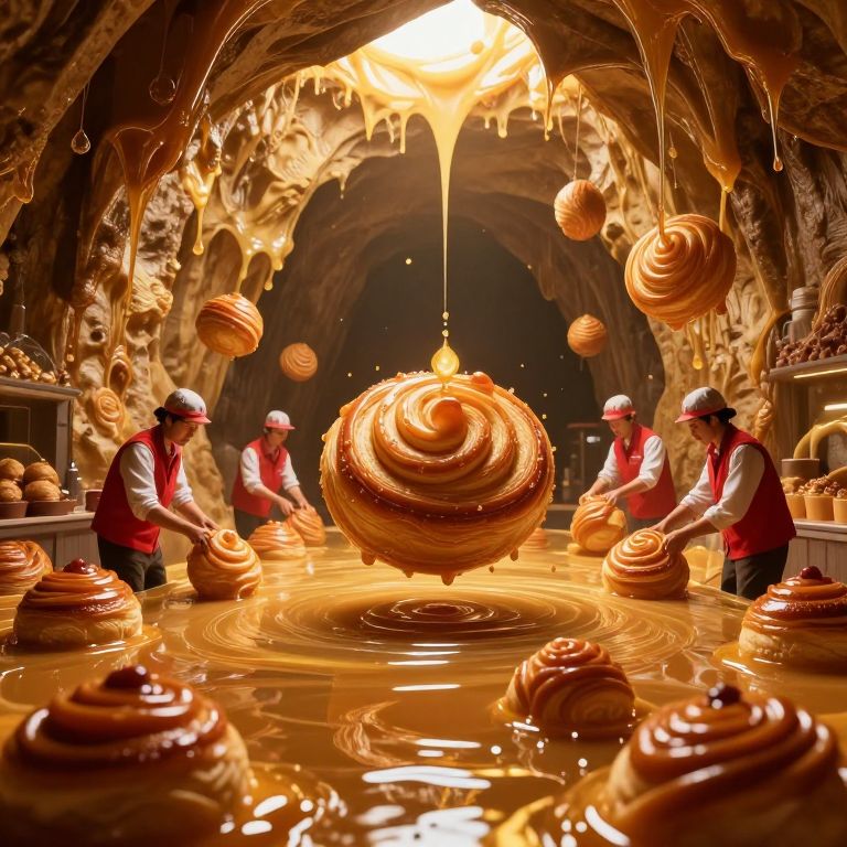 In a cavernous world of liquid gold and caramel-dripping walls, workers in red vests craft spiraling pastries that float serenely on a river of molten sweetness, as if conjured from a dream of indulgence.
