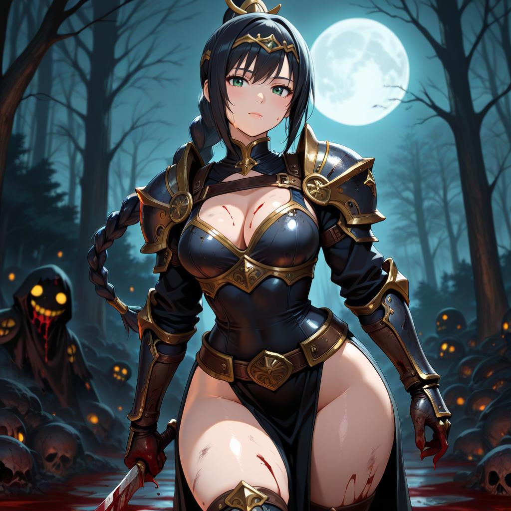 Masterpiece, best quality, 1girl, shadowheart, black hair, braided ponytail, green eyes, circlet, dirty, (blood:1.3), cleavage, medium breasts, armor, wide hips, thick thighs, thin waist night, (halloween:0.3), moon, creepy mist, outdoors, trees