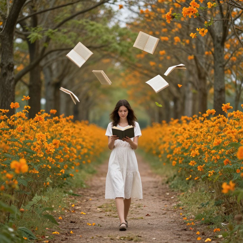 Photograph of a young woman with curly brown hair, wearing a white, short-sleeved, knee-length dress, standing in the center of a dirt path lined with vibrant orange flowers. She holds an open book and several more books float around her head, as if being lifted by an unseen force. The path is flanked by tall trees with green leaves, creating a tunnel effect. The background features a blurred view of more trees and flowers, enhancing the magical, whimsical atmosphere. The woman's expression is calm and focused, adding to the enchanting scene.