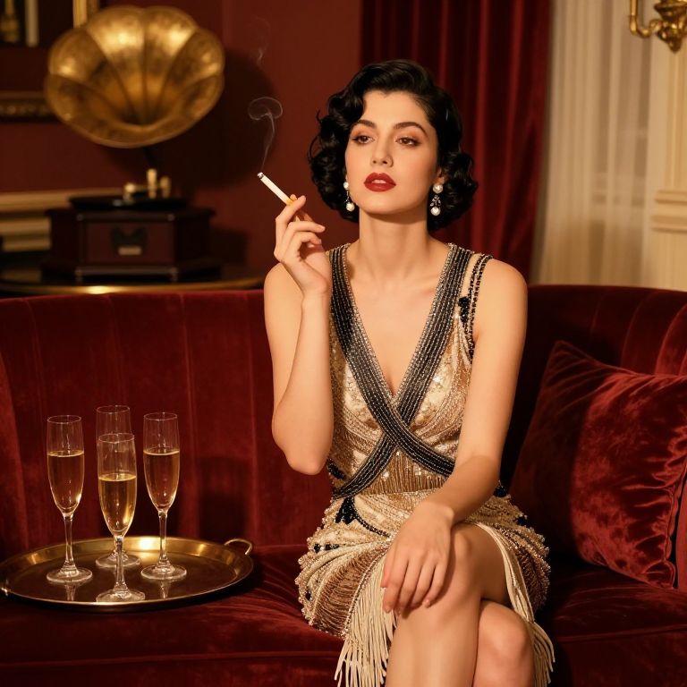 A vintage 1920s flapper sitting on a velvet divan in a stylish Parisian apartment, clutching a cigarette holder, wearing a beaded dress and pearl earrings, with a tray of champagne flutes and a vintage gramophone playing in the background.