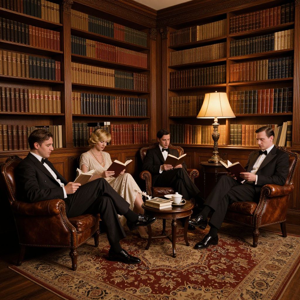 Photograph of three well-dressed men and a woman in elegant attire, reading books in a luxurious, wooden-paneled library with bookshelves,