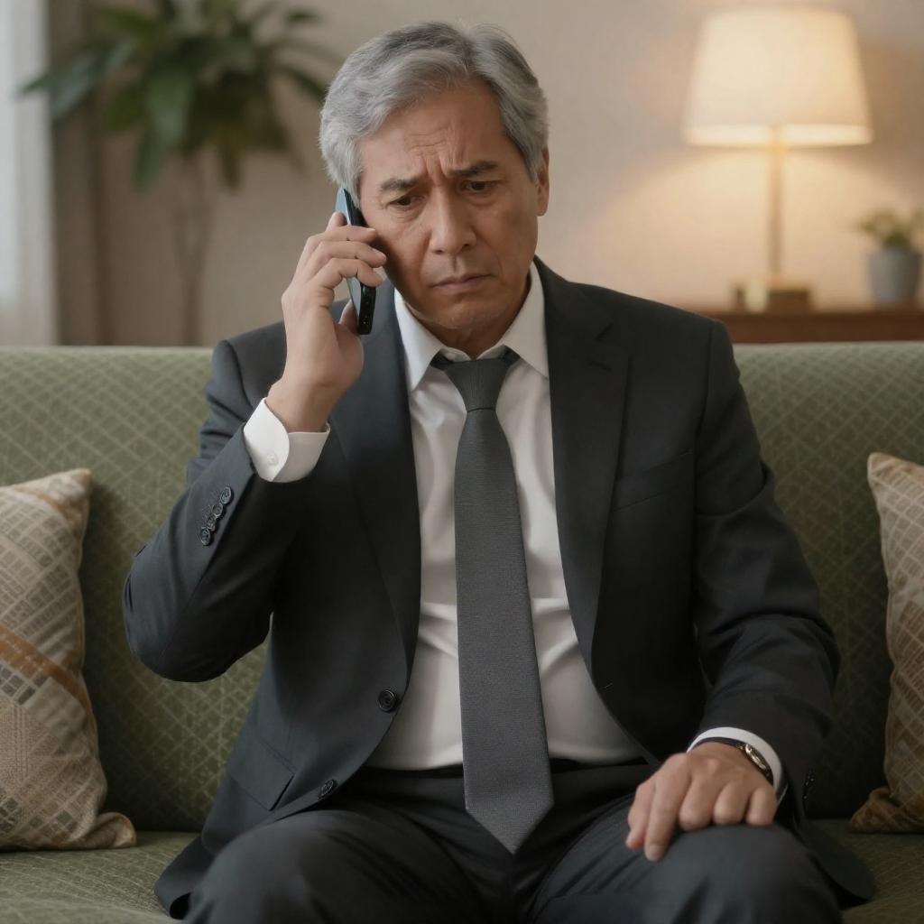 Middle-aged man with gray hair, wearing a dark suit, white shirt, and gray tie, sitting on a green-patterned couch. Holding a phone to his ear with a concerned expression. Background includes warmly lit lamps, green plant, and patterned pillows.