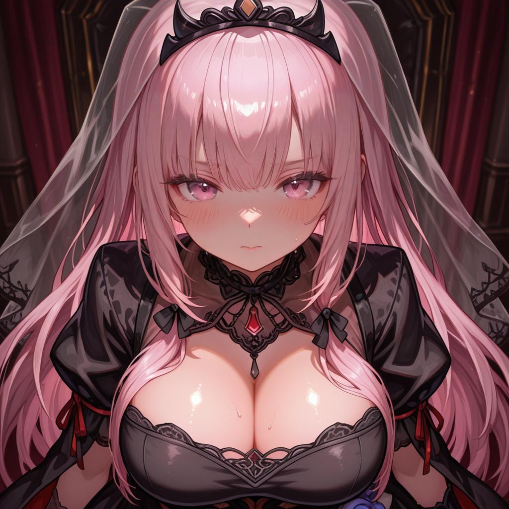 Score_9, score_8_up, source_anime, 1girl, two side up, tiara, black dress, cleavage, bridal gauntlets, bodystocking, veil, large breasts, garden, night sky, gothic architecture, holding purple flowers, bouquet, evil grin, looking at viewer
