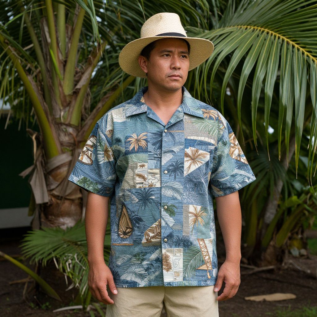 Photograph of a medium-built Asian man with a light brown complexion, standing in front of lush green palm trees. He wears a cream-colored straw hat, a blue Hawaiian shirt adorned with tropical patterns including palm leaves, pineapples, and butterflies, and beige pants. His expression is neutral, with a slight frown, and he stands with his arms relaxed at his sides. The background is blurred, emphasizing the man's colorful shirt and tropical attire. The lighting is natural, highlighting his features and the vibrant colors of his clothing.