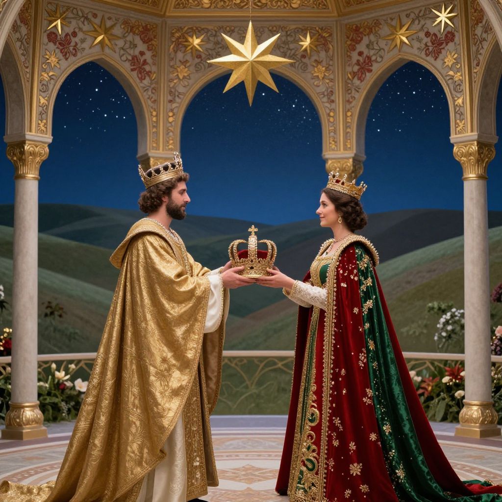 Two regal figures, a bearded man in golden robes and a crowned woman in red and green attire, engage in a ceremonial exchange of crowns beneath ornate arches adorned with gold stars and floral patterns, set against a backdrop of rolling hills and a starry night sky.