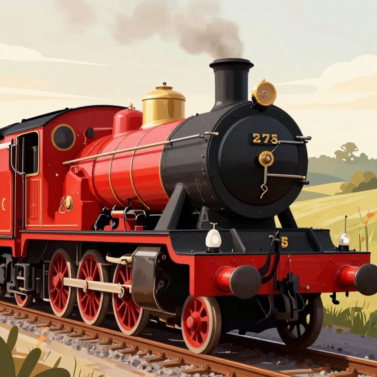 A vibrant digital illustration by Emily Page depicts a classic steam engine, Engine #25, rendered in bold reds and blacks with intricate gold accents, set against a serene countryside backdrop under soft, golden-hour lighting.