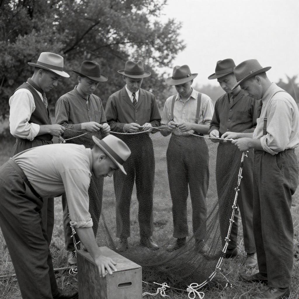 Black-and-white photograph of six men in 1930s-style clothing and hats, standing around a large fishing net being repaired by a man bending over a box in the foreground. The men observe the repair work, with trees and grass in the background. The net is tangled and positioned centrally.