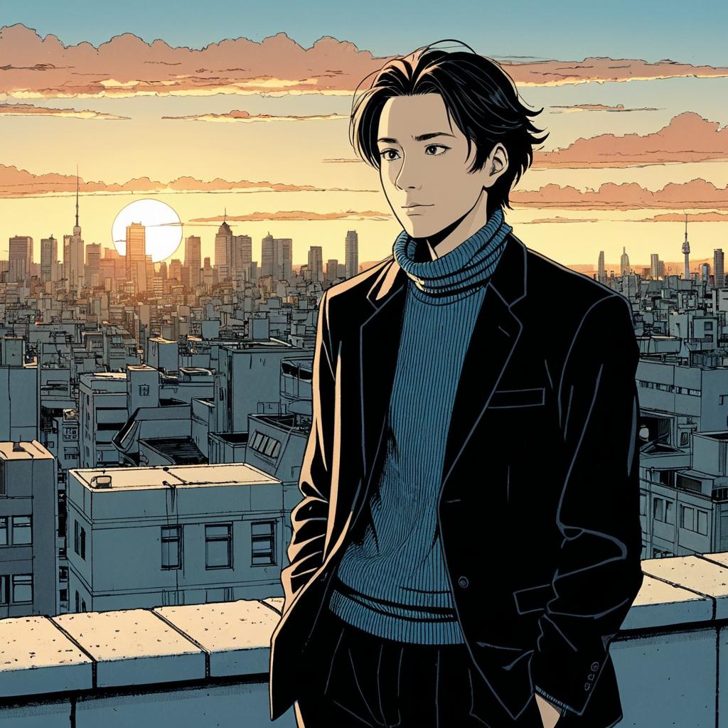 A weary detective, wearing a simple suit with a loosened tie, standing in a dimly lit interrogation room, expressing deep contemplation, illustrated in the realistic and suspenseful manga style of Naoki Urasawa.