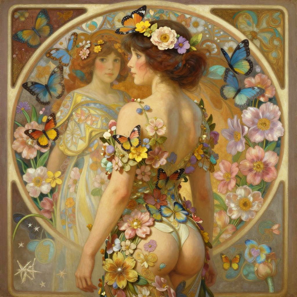 Masterpiece, best quality, (photorealistic:1.4), beautiful woman, from behind, round ass, medium close-up, low angle, high definition, 4k uhd, 8k, trending on artstation hq, in the style of pixar studio ghibli, jodhpurs greg manchess, greg rutkowski, alphonse mucha, oil painting! dream a cute beautiful flower girl wearing clothes made of flowers and butterflies : 0.6, by p