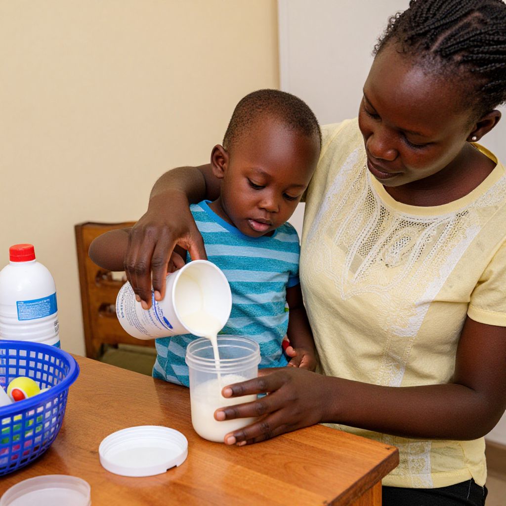 Photograph of an African woman and young boy in a kitchen. The woman, with dark skin and braided hair, wears a yellow lace top and assists the boy, who has short hair and dark skin, wearing a blue striped shirt. She pours milk from a white plastic cup into a clear plastic cup he holds. On the wooden table are a blue basket with a red-capped milk bottle, a white cap, and the filled cup. The background shows a plain, cream-colored wall and a wooden chair. The image is brightly lit, highlighting their focused expressions.