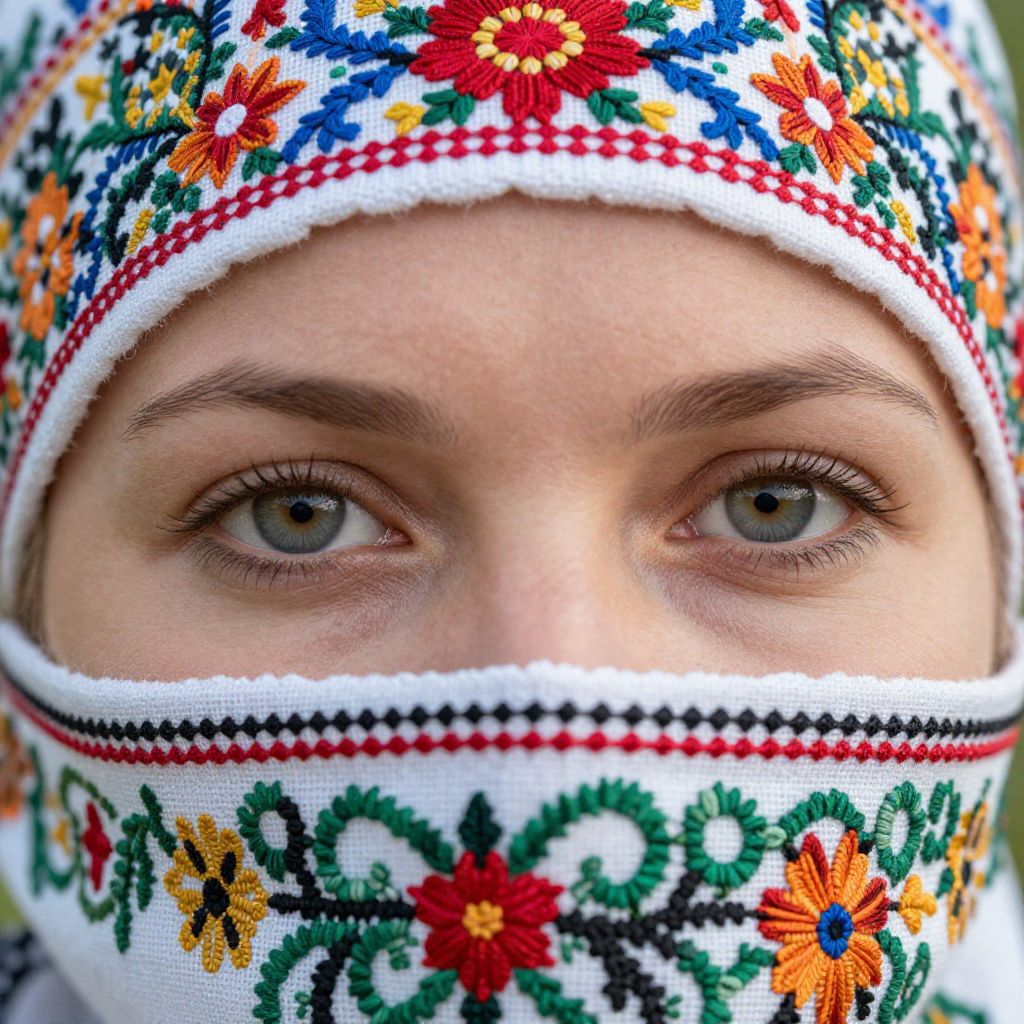 Estonian eyes framed by traditional folk costume, intricate embroidery patterns, soft daylight, cultural heritage theme, warm textures and natural beauty, hyper-realistic style with detailed facial features and expressive eyes