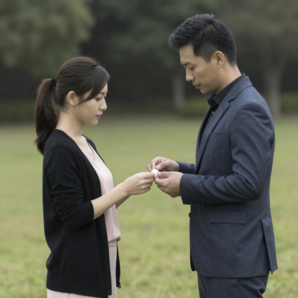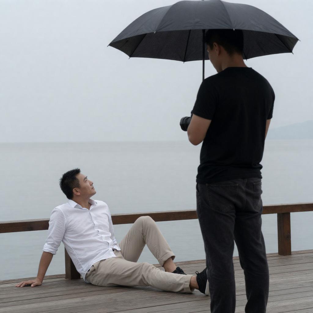 Photograph of an Asian couple walking outdoors on a rocky path. The man, in a black suit and white shirt, carries the woman, who has short black hair and wears a white blouse, smiling and leaning on his shoulder. The background is a gray, rocky terrain with scattered white stones.