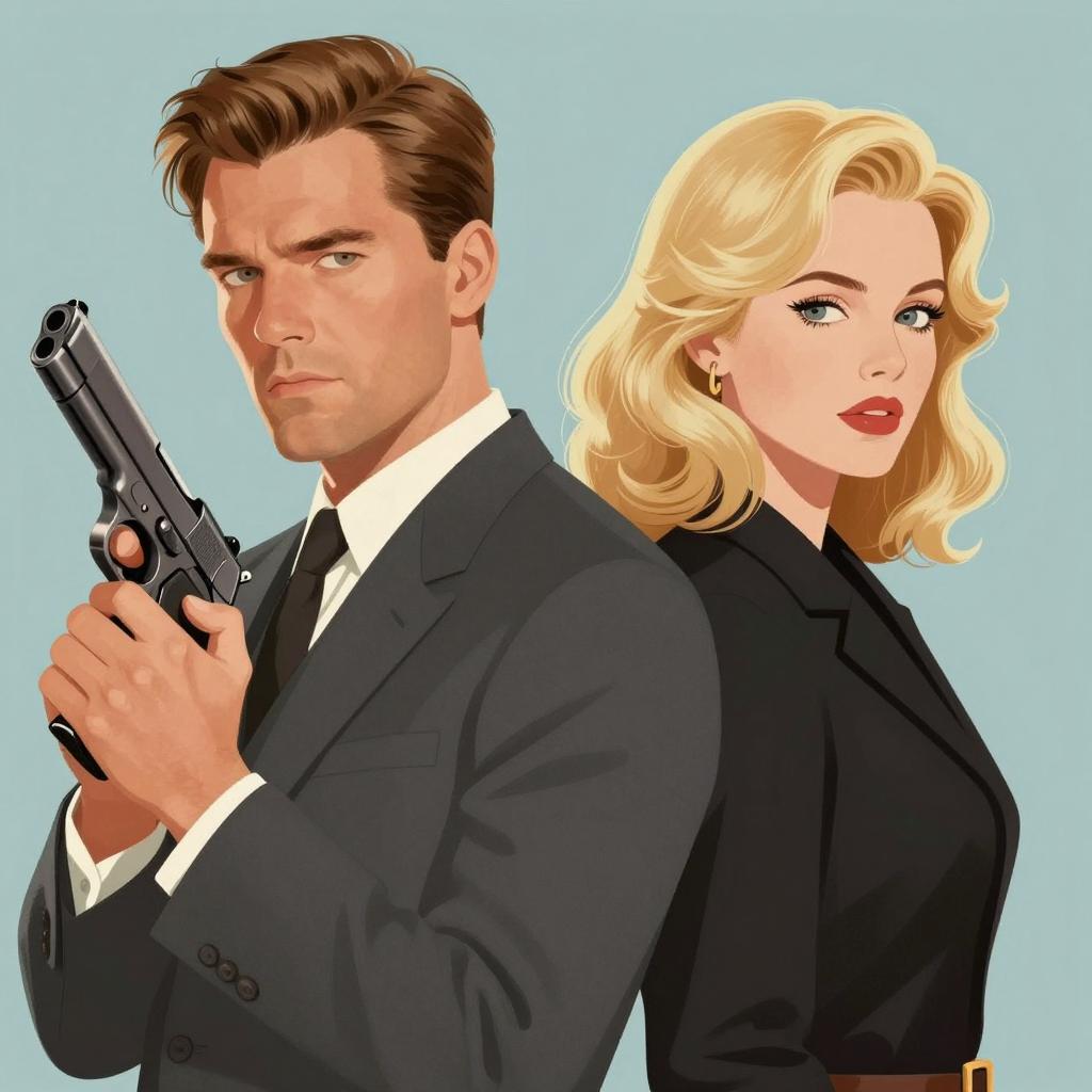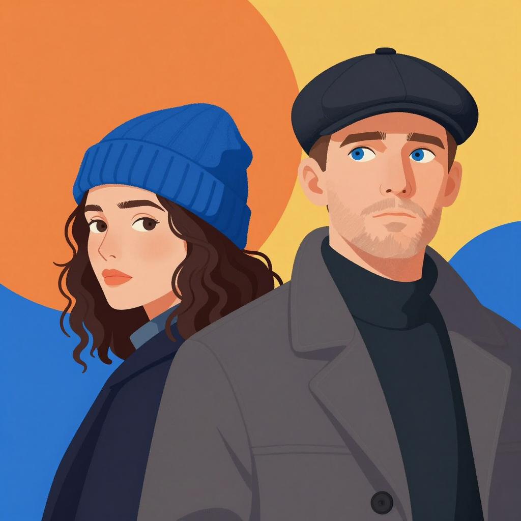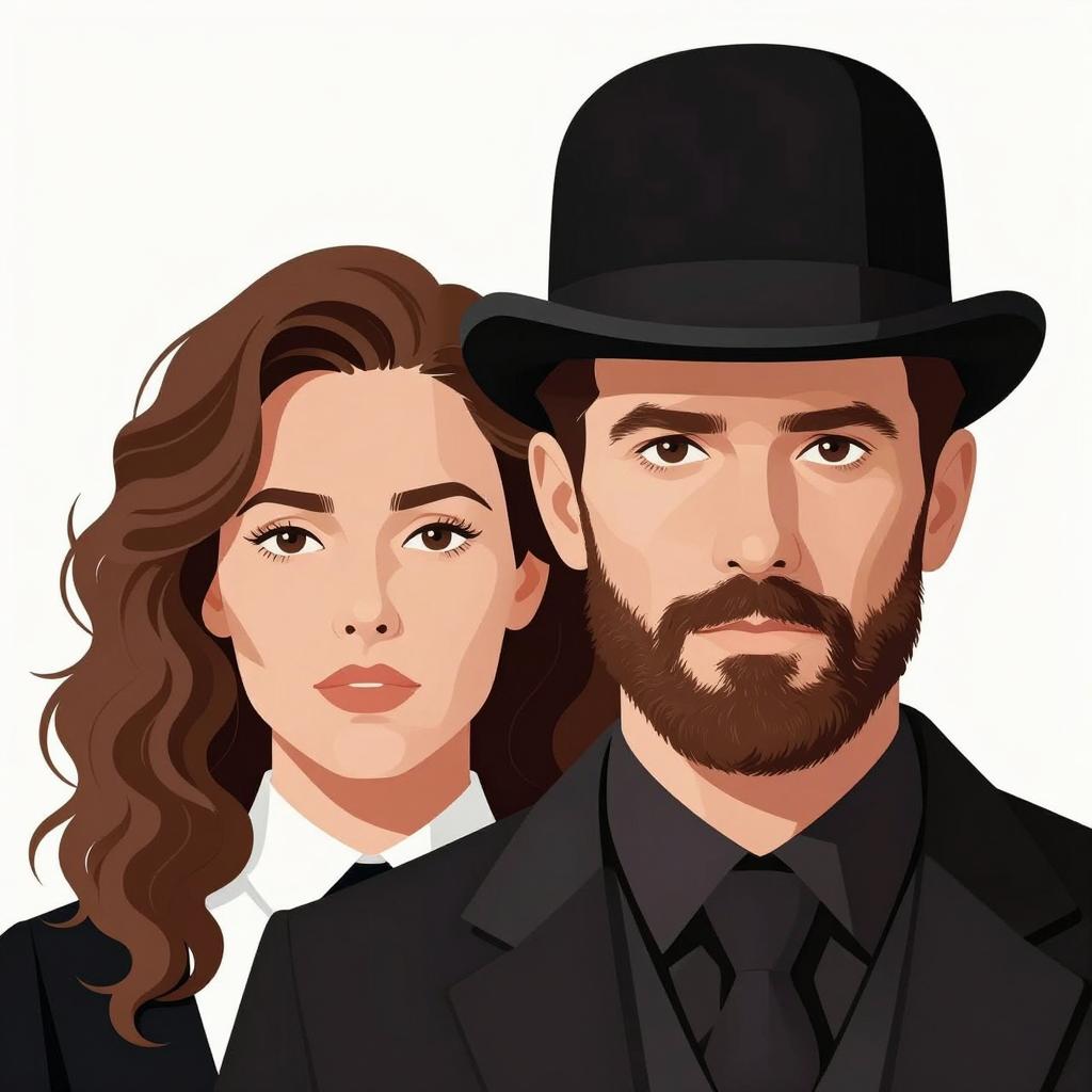 Illustration of two people, a man and a woman, with their upper bodies and heads overlapping. The man has a dark beard, intense gaze, and wears a black bowler hat. The woman has curly brown hair, light skin, and a neutral expression, wearing a white collar with a black ribbon. White background.