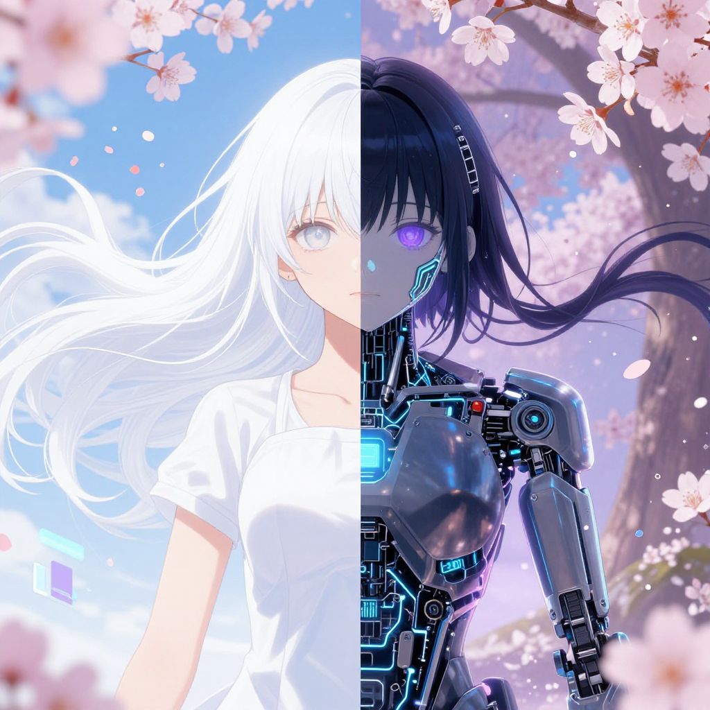 Hybrid anime girl with dual personalities visualized through contrasting halves; one side is pristine and human with flowing hair, the other side with robotic components and glowing circuits, set in a surreal dreamscape filled with floating digital fragments and cherry blossoms