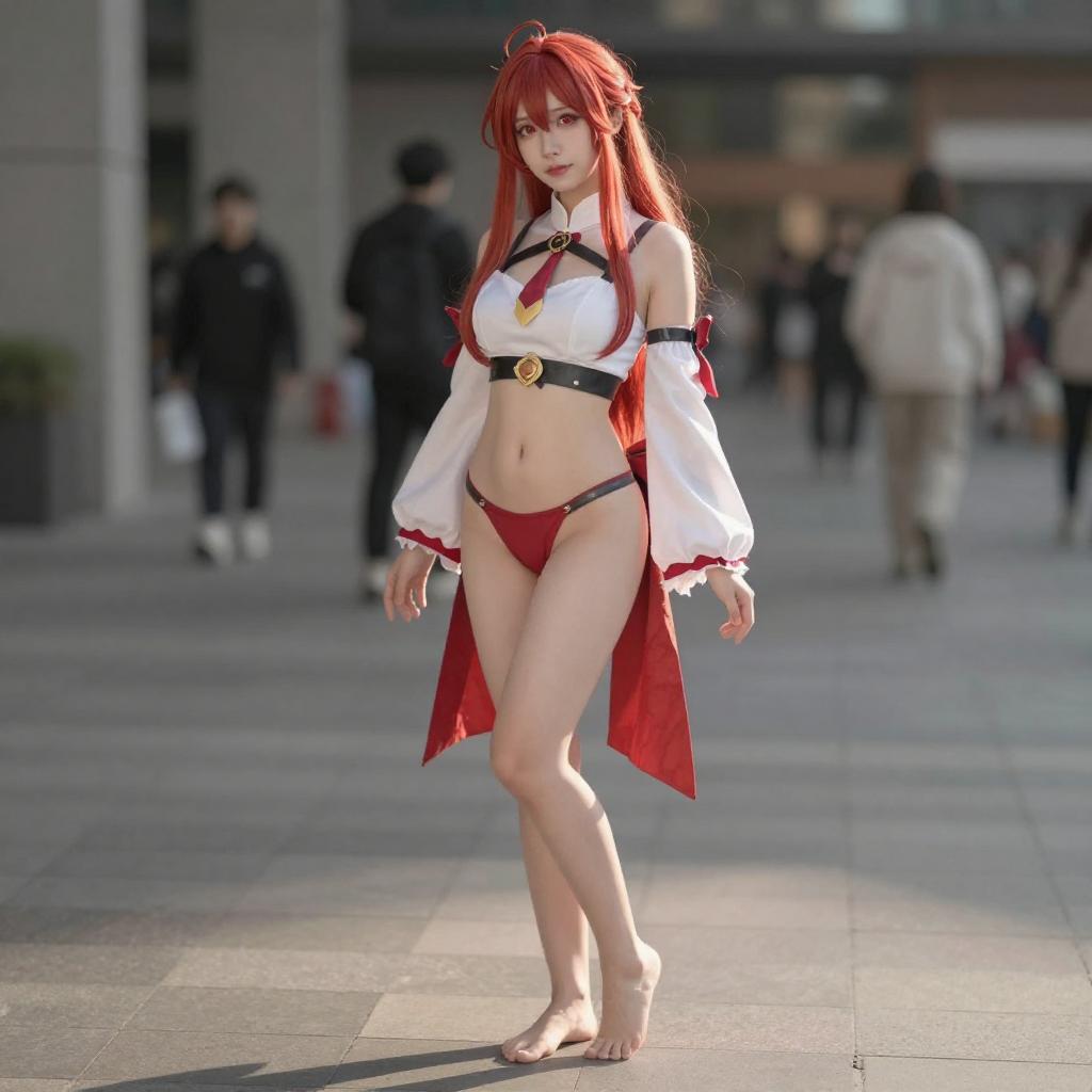 Photo-realistic cosplay photo of person standing in mordred (swimsuit rider) (fate) costume. 1girl, green eyes, blonde hair, long hair, ponytail, braid, sidelocks, hair scrunchie, small breasts, medium breasts, navel, collarbone, red bikini, side-tie bikini bottom, string bikini, halterneck, red scrunchiefull body shot. lifestyle stock photo, shallow depth of field, lifestyle stock photography, shallow depth of field, natural lighting, warm tones, soft background blur, vibrant colors, realistic textures, professional photoshoot