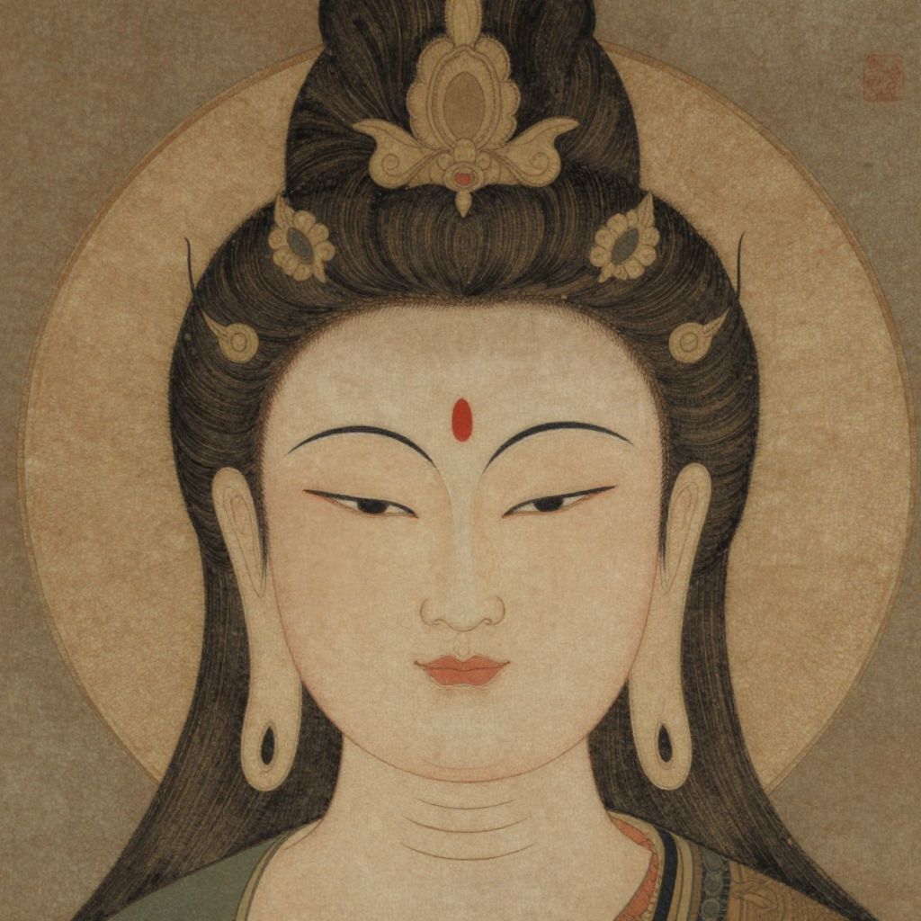 Traditional East Asian painting of a serene-faced goddess with black hair, red dot on forehead, gold earrings, and circular halo.