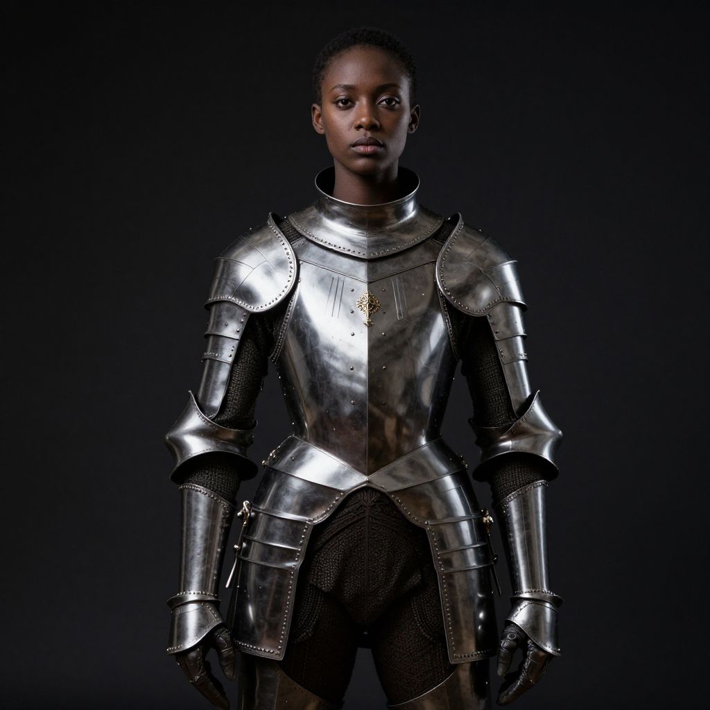 Photograph of a serious African-American woman in shiny, medieval-style silver armor, standing against a dark background, showcasing her strong, determined expression.