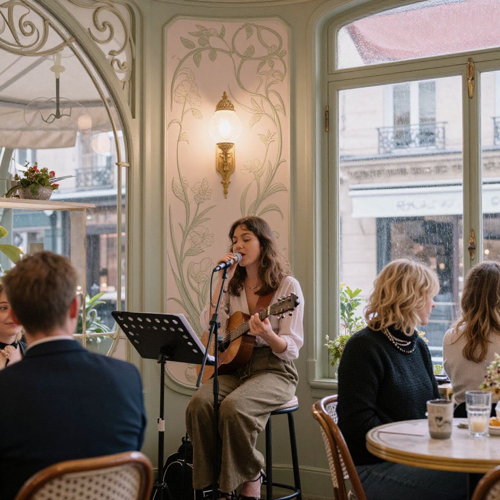 Chantant moment captured in an elegant Parisian café, vintage decor with art nouveau style, a soulful singer immersed in their music, patrons lost in the ambiance, soft pastel color palette, gentle rain outside the window adds a reflective and romantic feel
