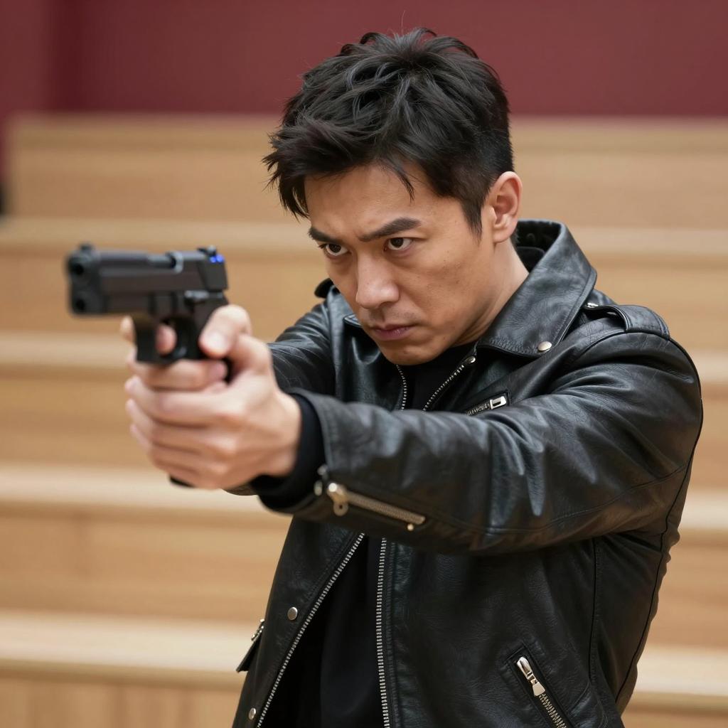 A muscular man in a military uniform and cap aiming a handgun forward with a focused and determined expression. Smoke emanates from the handgun, creating a dramatic effect against a dark, indoor background with subtle blue and white lighting. The man appears intense and alert, emphasizing strength and concentration.